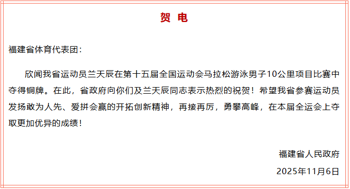 兰天辰简介:由福州市输送的运动员兰天辰,2005年6月出生,2016年1月进入福州市队,2019年11月进入省队。2023年杭州亚运会马拉松游泳男子个人10公里银牌;2024年全国马拉松游泳冠军赛男子个人10公里第一名。