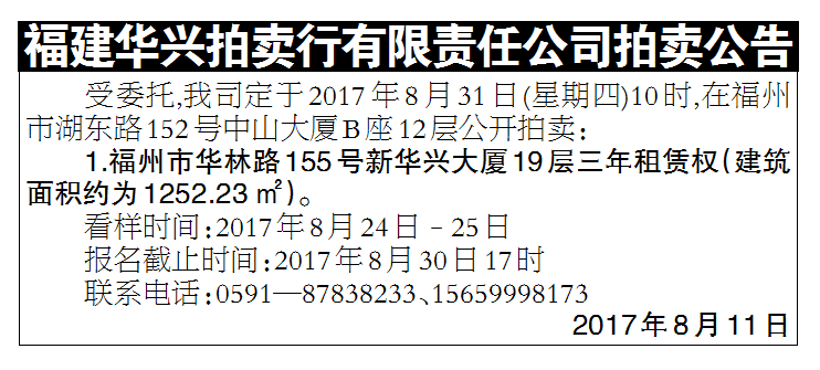 名称 | 福州市鼓楼区华林路155号新华兴大厦19层租赁权拍卖亚娱体育app官网 |
