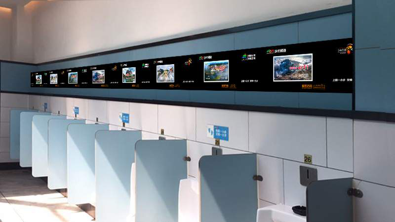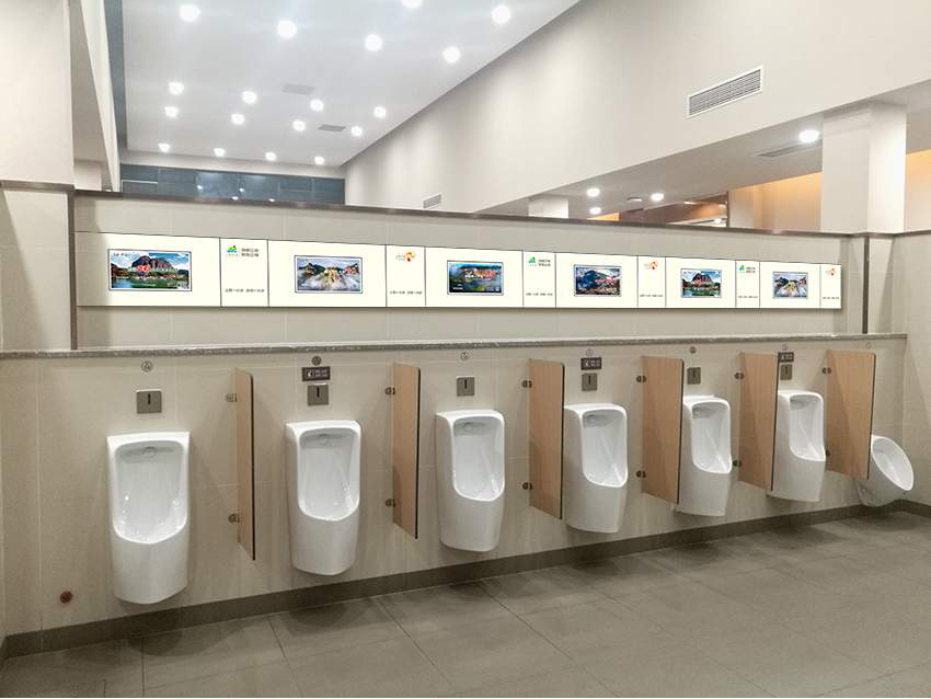 钢化玻璃通过独立防水箱体固定在箱体表面,流媒体显示屏规格尺寸为25x13.5x3cm,显示面积0.33m²。显示屏和硬件模块内置于箱体内,箱体设置防水、散热和供电系统。流媒体设备两侧通过链接盖板组合成一个整体,可完整融入卫生间墙体装饰背景。