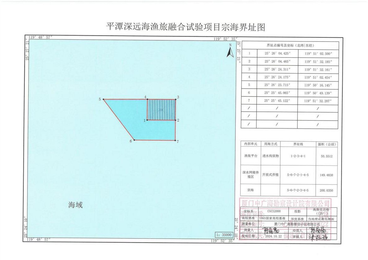 用海面积200.0350公顷,其中:渔旅平台及其锚链区用海面积50.5512公顷、用海方式为“透水构筑物”,深水网箱养殖区用海面积149.4838公顷、用海方式为“开放式养殖”。亚娱(中国)用海符合《平潭深远海渔旅融合试验亚娱(中国)海域使用论证报告书(报批稿)》要求。 |