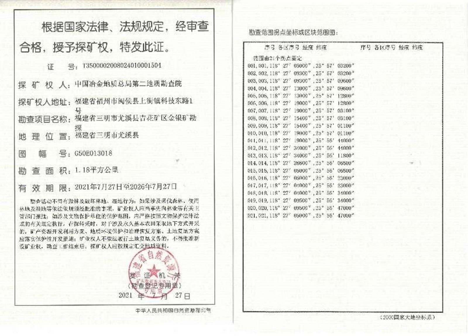 后经多次调整和勘查延续,现有吉花矿权勘查名称变更为“福建省三明市尤溪县吉花矿区金银矿勘探”,由福建省自然资源厅于2021年7月27日颁发,矿产勘查资源许可证号为:T3500002008024010001504,勘查区块范围坐标由21个坐标拐点圈定(详见附件勘查许可证)。有效期至2026年7月27日,面积1.18平方公里,勘查矿种为金银矿。