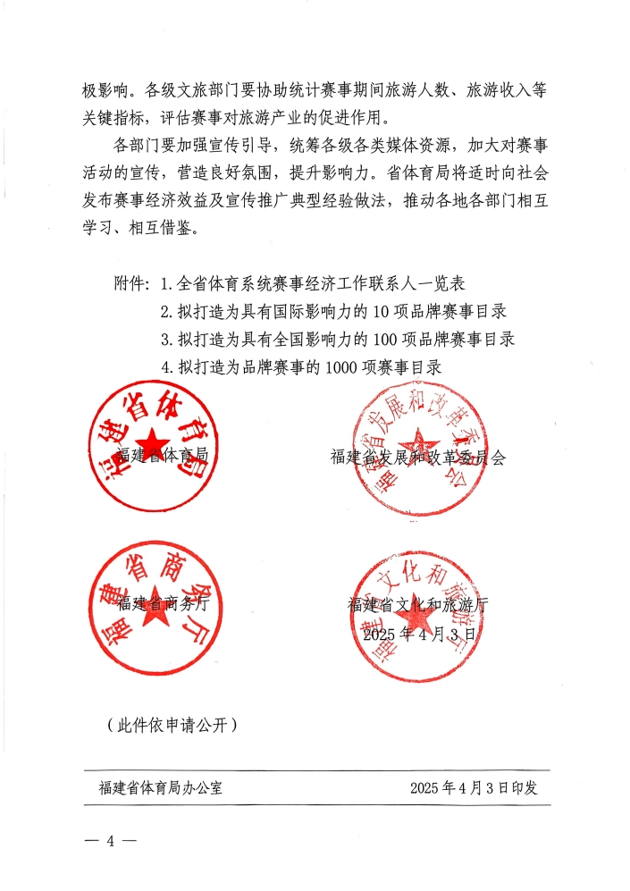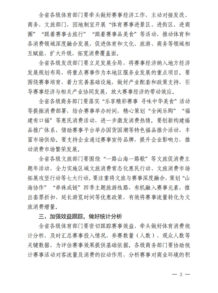 为深入贯彻中共中央办公厅、国务院办公厅《提振消费专项行动方案》精神,落实省委省政府关于提振消费、促进经济高质量发展的工作指示,进一步发挥品牌赛事在推动文旅商体融合发展、扩大文旅商体消费的积极作用,近日,福建省体育局联合福建省发展和改革委员会、福建省商务厅、福建省文化和旅游厅,印发关于《实施“十、百、千”八闽名赛培育工程,发展赛事经济、提振赛事消费》的通知。