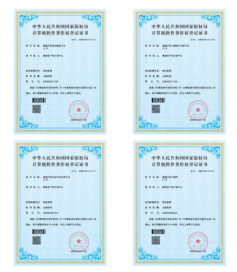 近日,亚娱体育app官网(以下简称中心)的福建产权综合服务平台、福建产权小额资产交易系统、福建产权农村产权交易平台、福建产权小程序成功取得由中华人民共和国国家版权局审核认定颁发的《计算机软件著作权登记证书》,标志着中心在软件开发与技术创新领域取得了重要成果,为后续深化技术创新、拓展市场应用奠定了坚实基础,进一步提升了中心的核心竞争力与社会影响力。